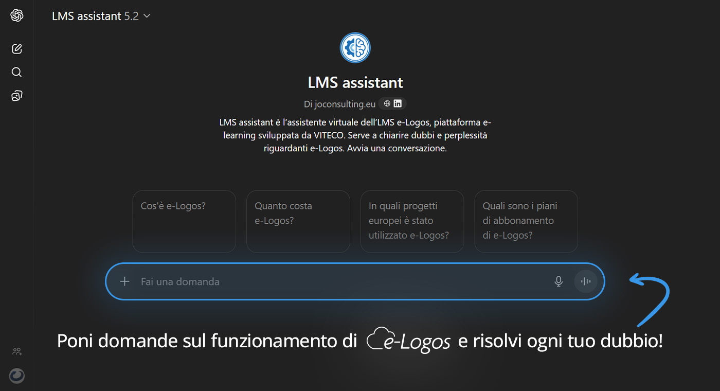 LMS assitant sfrutta tutte le funzioni integrate in ChatGPT standard, come la ricerca sul web e la generazione di immagini, ma possiede una knowledge di base ad hoc per fornirti informazioni accurate su e-Logos e assisterti nelle operazioni che svolgeresti con la piattaforma.