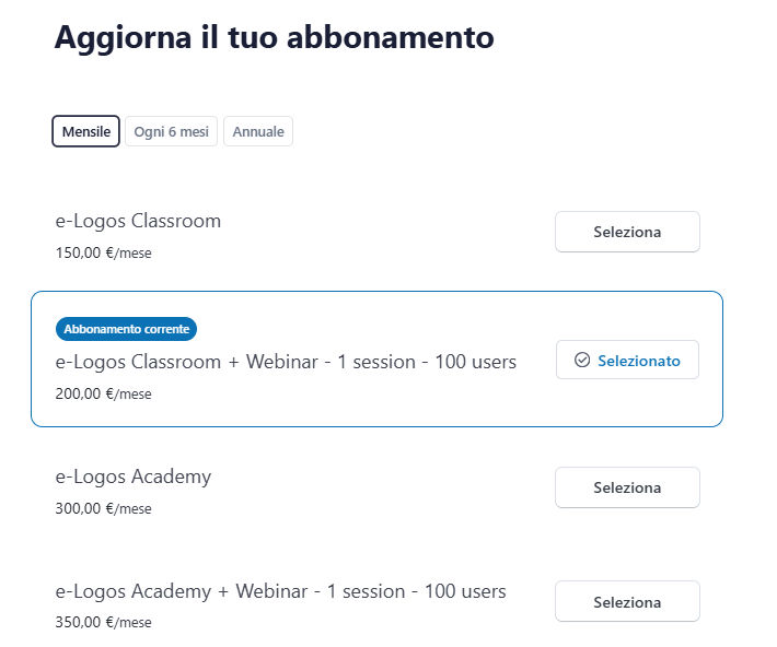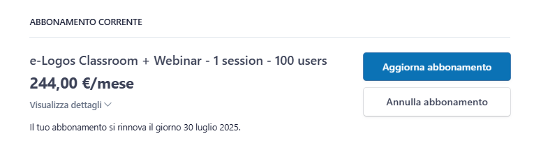 Puoi gestire in autonomia il tuo piano di abbonamento direttamente dalla piattaforma e-Logos, accedendo al portale Stripe.