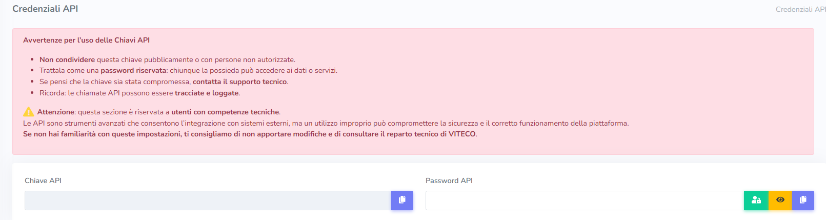 Questa sezione è riservata a utenti con competenze tecniche. Le API sono strumenti avanzati che consentono l’integrazione con sistemi esterni, ma un utilizzo improprio può compromettere la sicurezza e il corretto funzionamento della piattaforma.