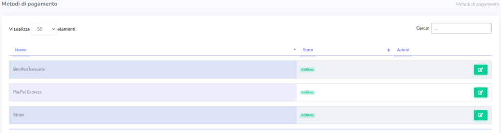 Solo i power users con ruolo Admin possono modificare i metodi di pagamento attivi nella piattaforma. I metodi disponibili sono tre: