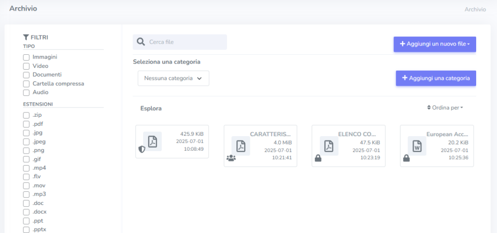 Le categorie permettono di organizzare i file caricati nell’Archivio, facilitando la consultazione e la ricerca da parte degli utenti.
