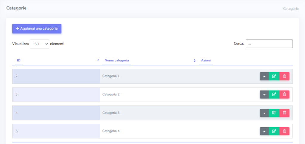 - creare sottocategorie: cliccando sull’icona con la freccia verso il basso, si apre una sezione in cui è possibile visualizzare, aggiungere o gestire sottocategorie collegate alla categoria principale.;
