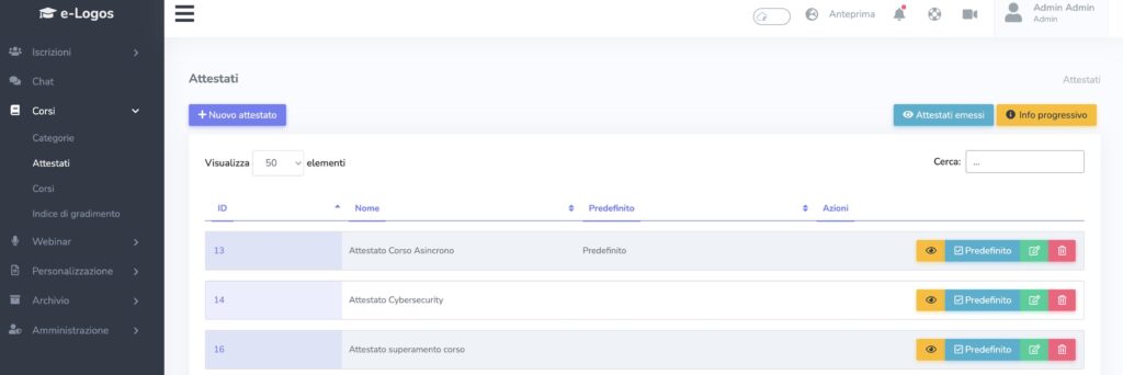 La sezione Attestati consente di creare e visualizzare gli attestati di superamento dei corsi. La schermata principale mostra l’elenco degli attestati creati su cui è possibile effettuare delle azioni, ossia:
