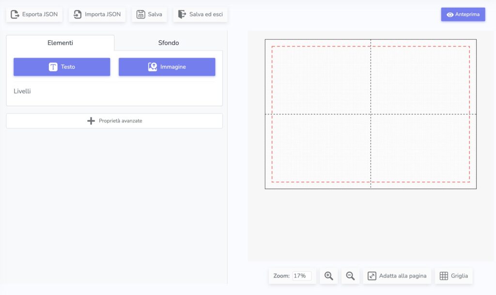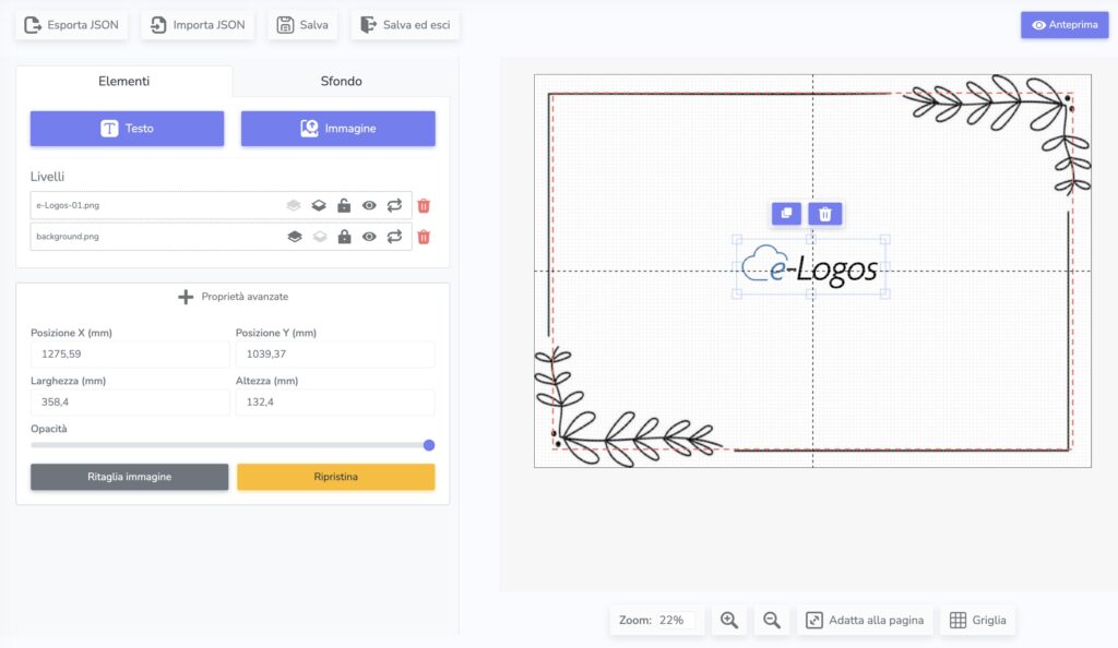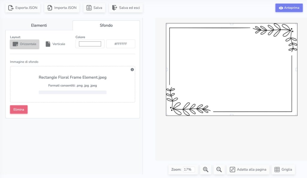 Tramite la sezione Elementi possiamo aggiungere testo e immagini sul nostro attestato.