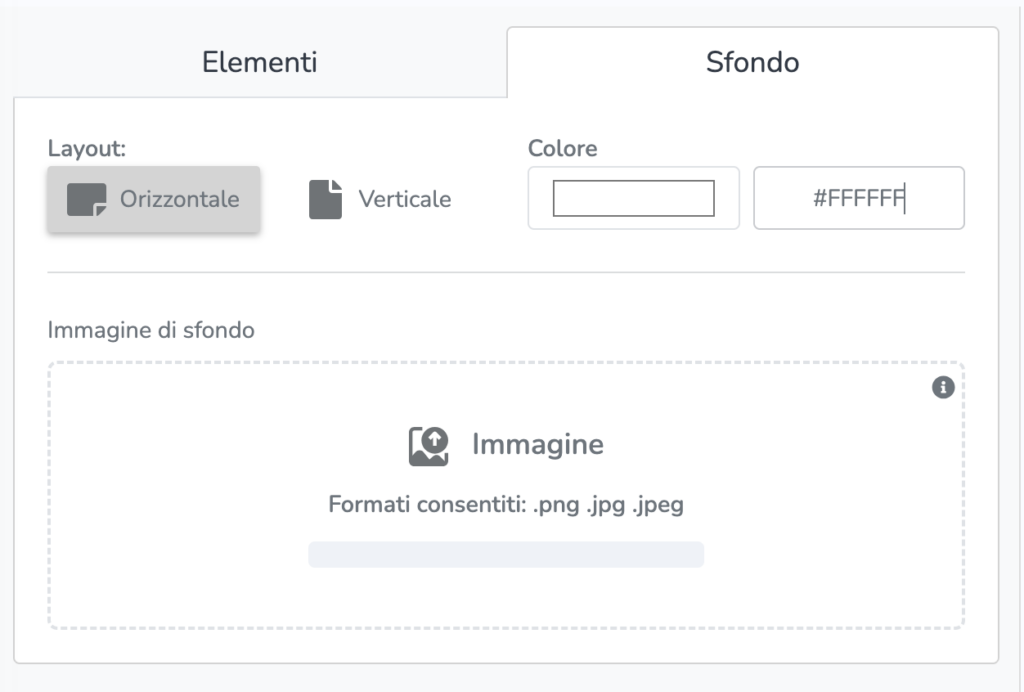 Clicca su Sfondo e scegli il layout che preferisci, tra orizzontale e verticale. Se non vuoi caricare un’immagine di sfondo, puoi scegliere un colore dal box o digitare il codice esadecimale (HEX).