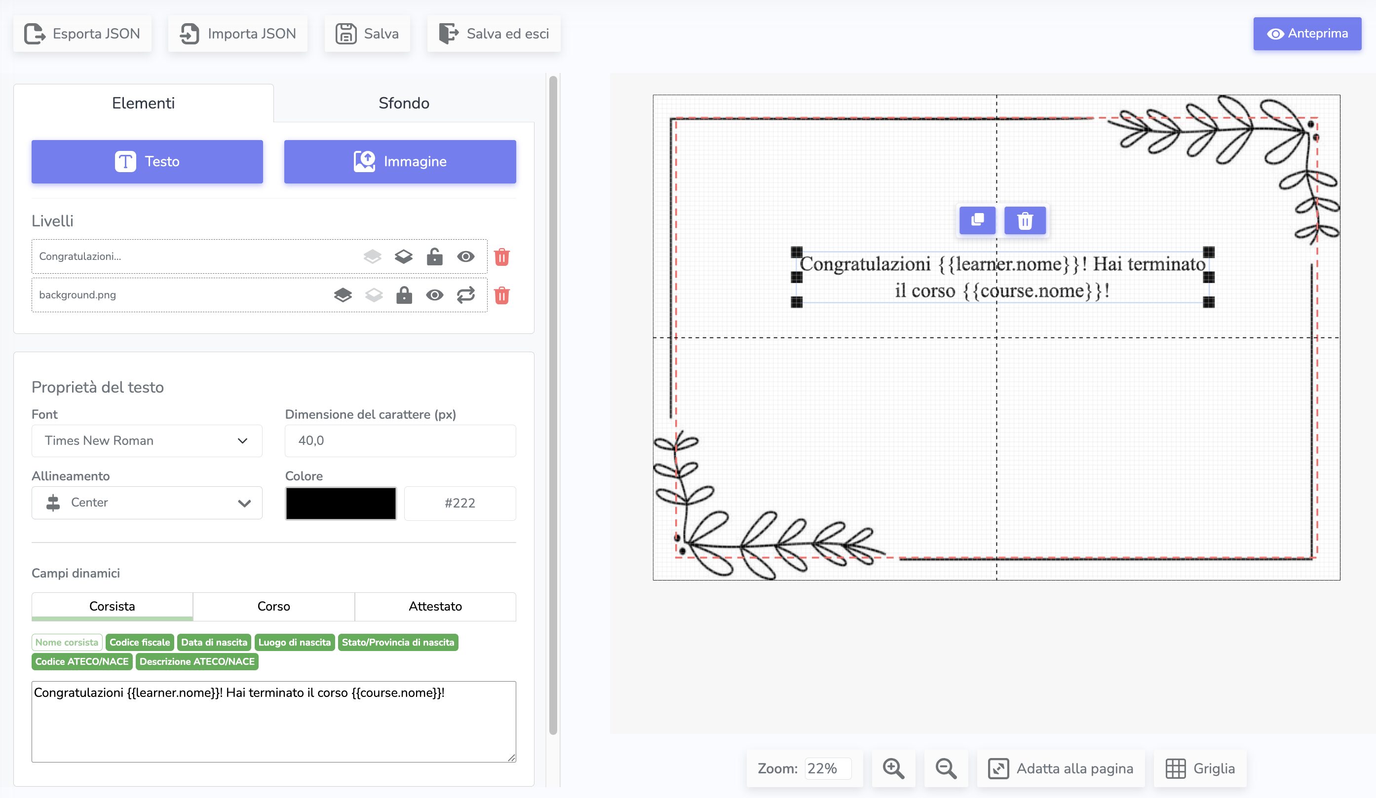 I campi dinamici sono degli spazi speciali all’interno dell’attestato che si aggiornano automaticamente con le informazioni specifiche. Ad esempio, invece di scrivere manualmente il nome del partecipante o la data, puoi inserire un campo dinamico che verrà sostituito automaticamente con i dati giusti ogni volta che generi un nuovo attestato.