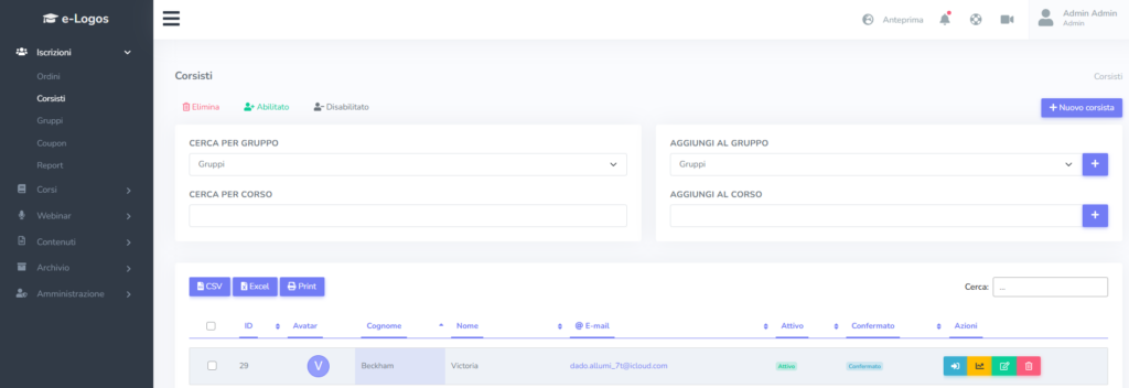 La sezione Corsisti permette di iscrivere nuovi discenti e gestire quelli già registrati in piattaforma.