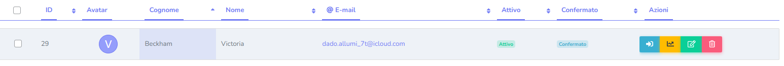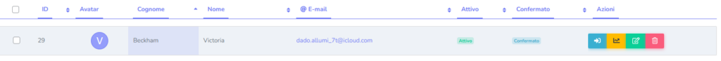 All’interno della sezione Corsisti è possibile effettuare modifiche sullo status del discente: quando il corsista è ATTIVO, possiamo cliccare sulla voce e disattivarlo, senza eliminare il suo profilo; lo status CONFERMATO è attivo di default se il corsista viene creato dal back-end; nel caso in cui si iscriva autonomamente lo status sarà NO e cambierà in CONFERMATO non appena l’utente confermerà l’avvenuta iscrizione tramite l’e-mail.