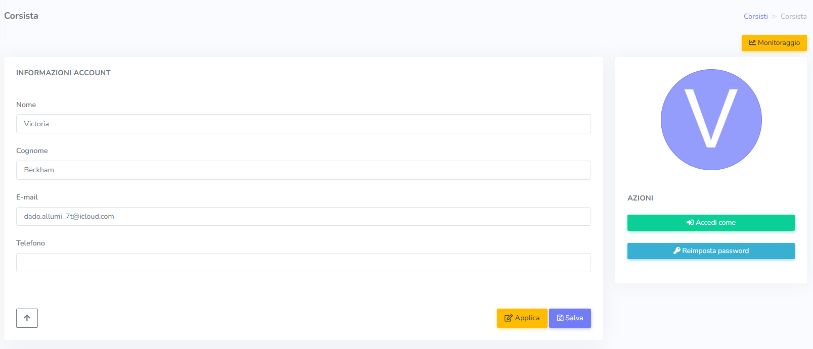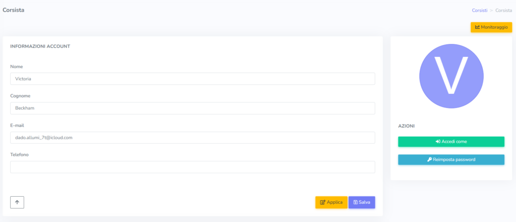 Cliccando sul corsista, è possibile visualizzare e modificare le informazioni basilari aggiunte, oltre a reimpostare la password (in caso di necessità) e accedere con il suo profilo, in modo tale da verificare la corretta visualizzazione delle informazioni.