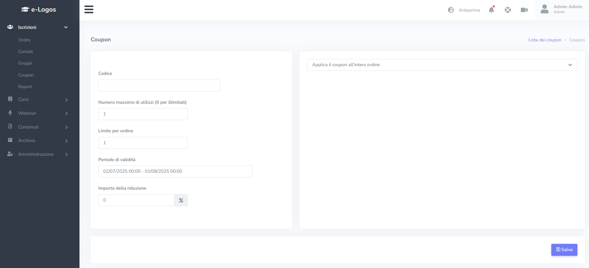 La sezione Coupon permette all’Amministratore di generare dei coupon da poter condividere con gli utenti per singoli corsi o da applicare all’intero carrello. Per generare un nuovo coupon è necessario cliccare su Nuovo coupon e compilare i seguenti campi: