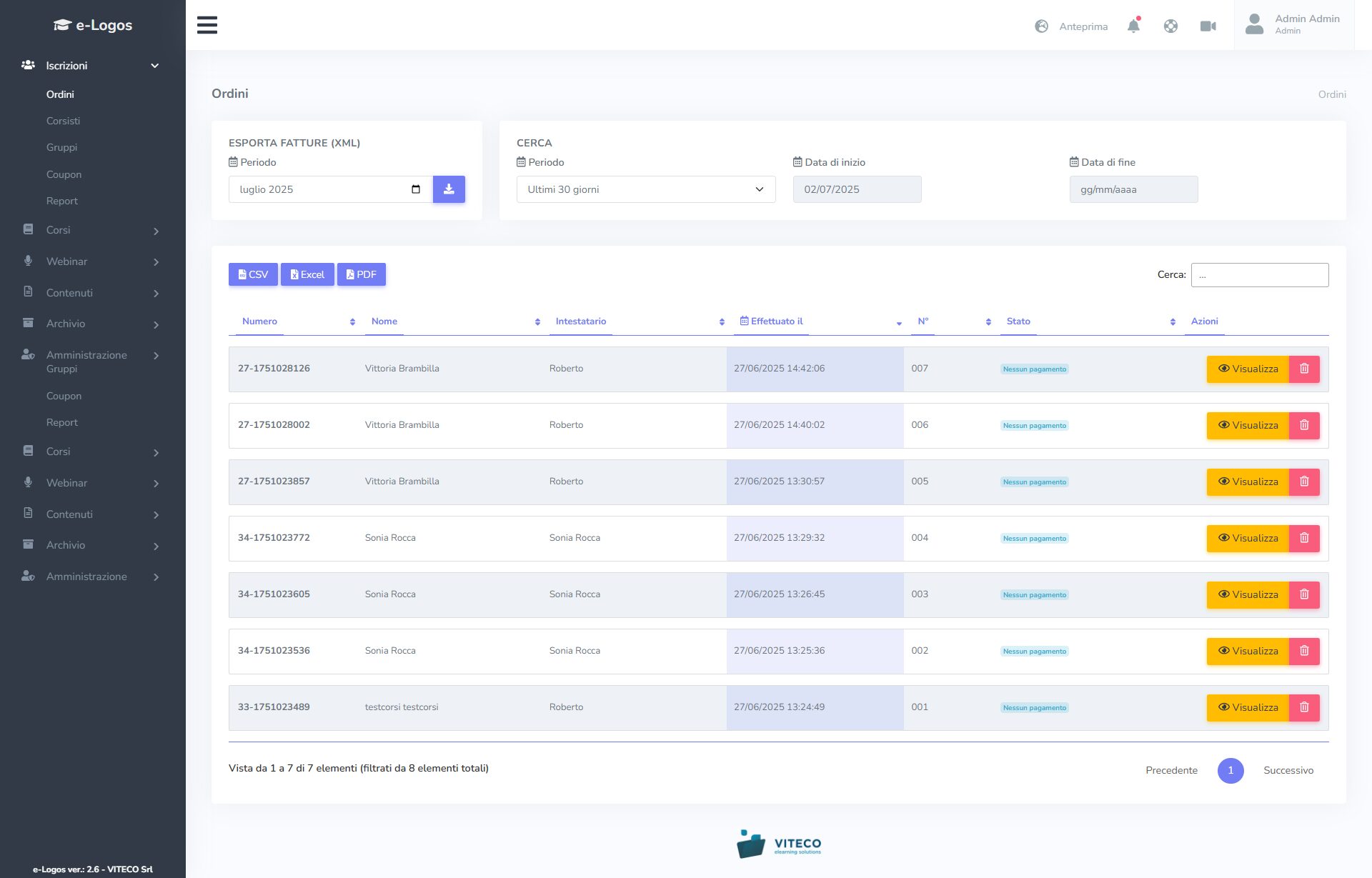 I pulsanti CSV, Excel e PDF scaricano l’elenco degli ordini ricevuti nei diversi formati.