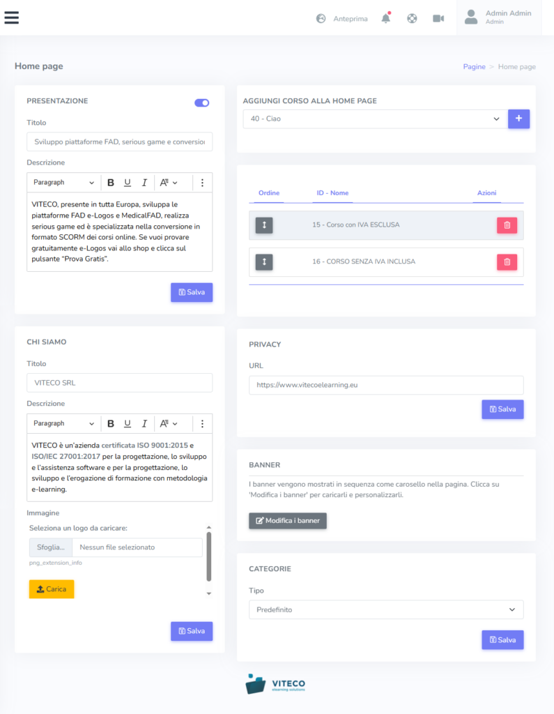 Attenzione: è importante cliccare su Salva per ogni box modificato. In caso contrario, le modifiche potrebbero andare perse.