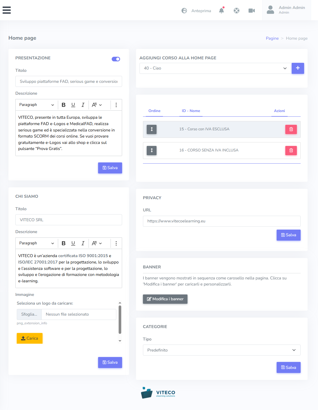 All’interno di questa sezione è possibile modificare i contenuti presenti in Homepage, inserendo:
