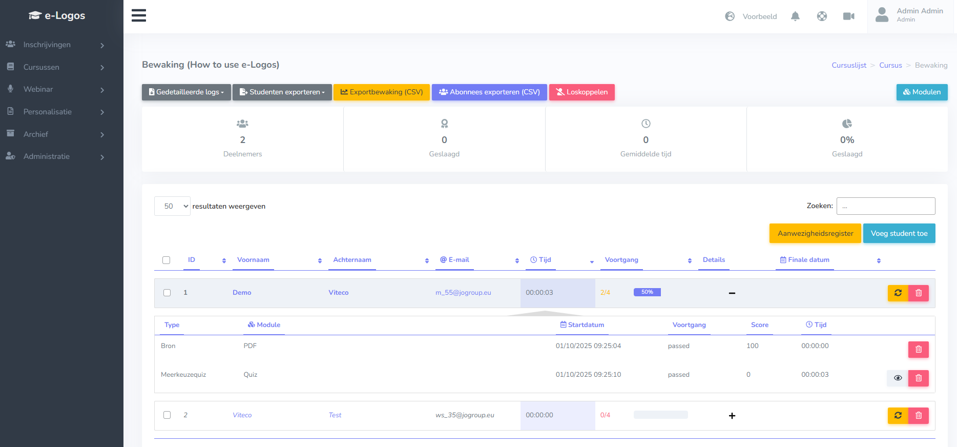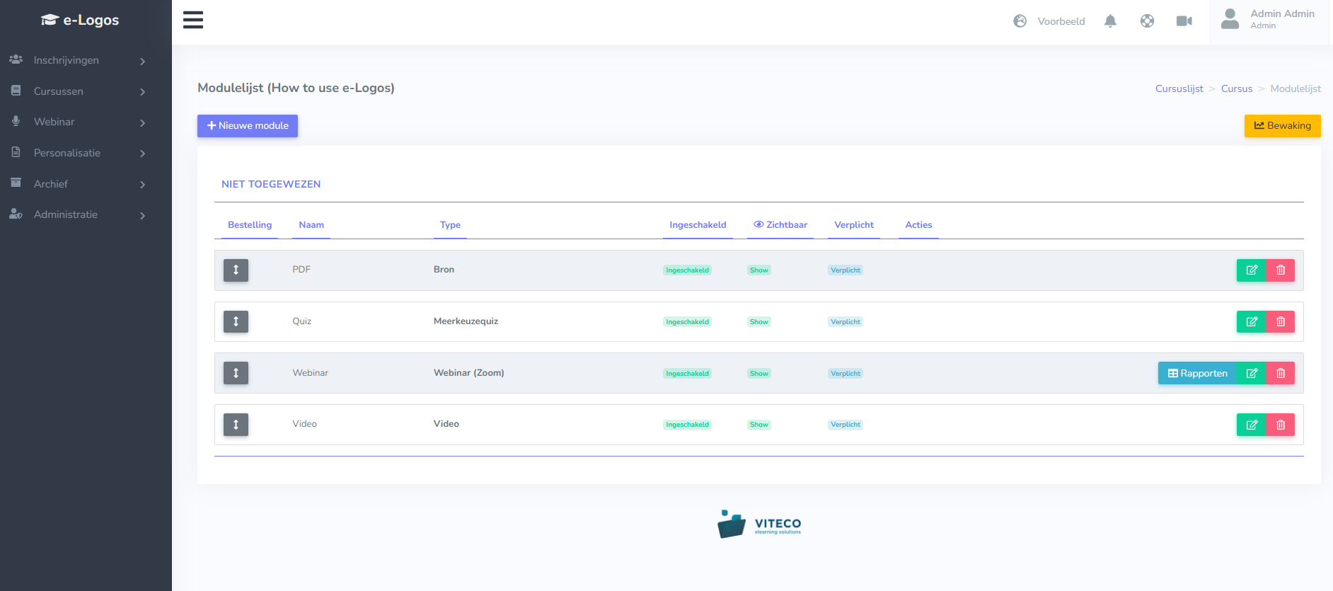 ✓Docent: cursussen beheren, activiteiten volgen en chatten met cursisten;