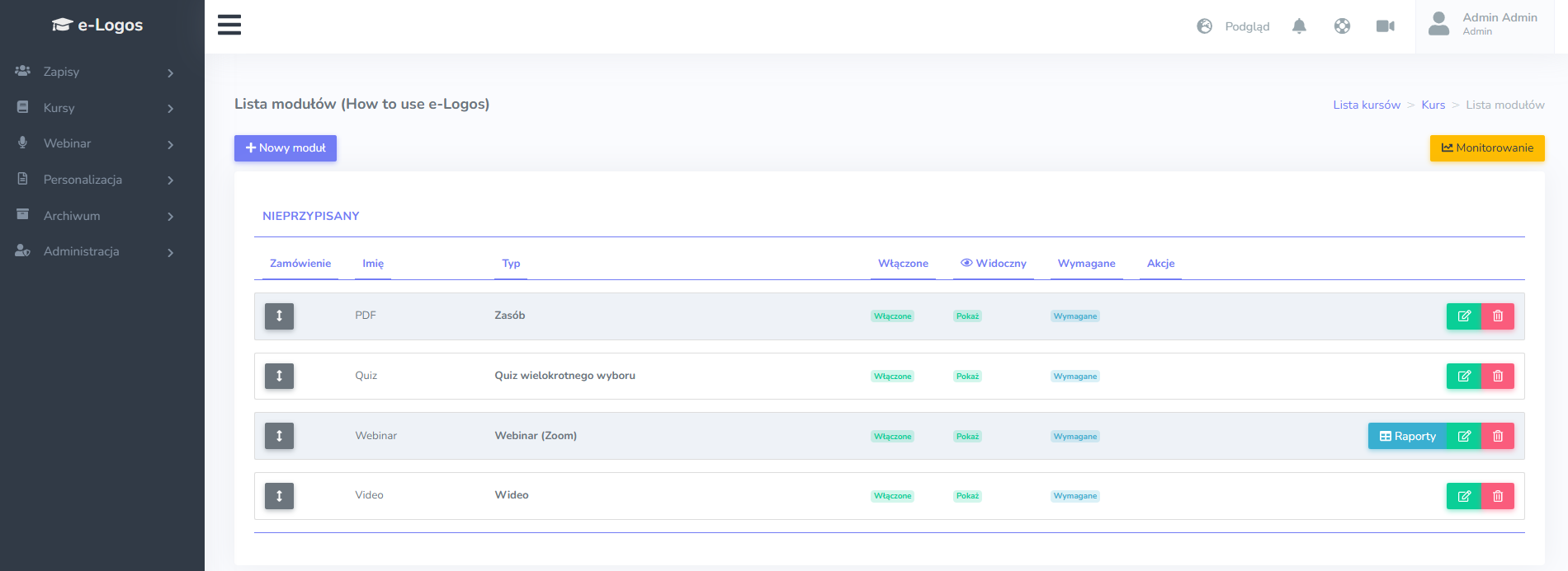 - dodawać nieograniczoną liczbę kursów z interaktywnymi modułami;