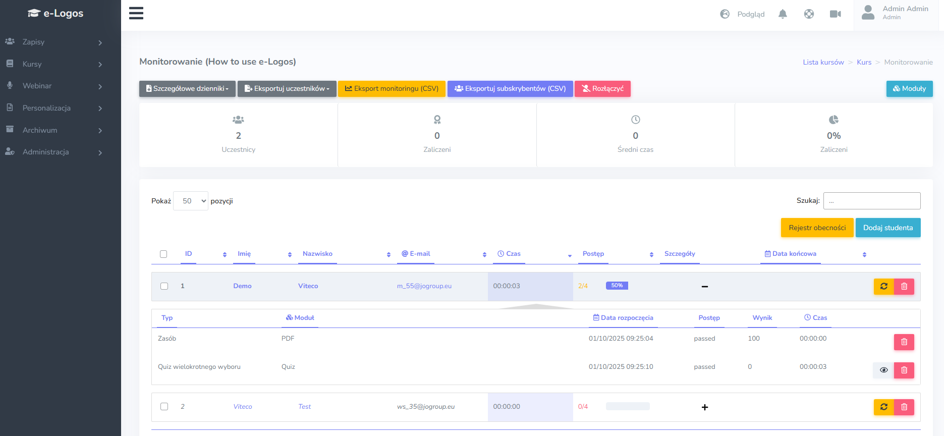 ✓Nauczyciel: zarządzanie kursami, śledzenie aktywności i czat z uczestnikami;