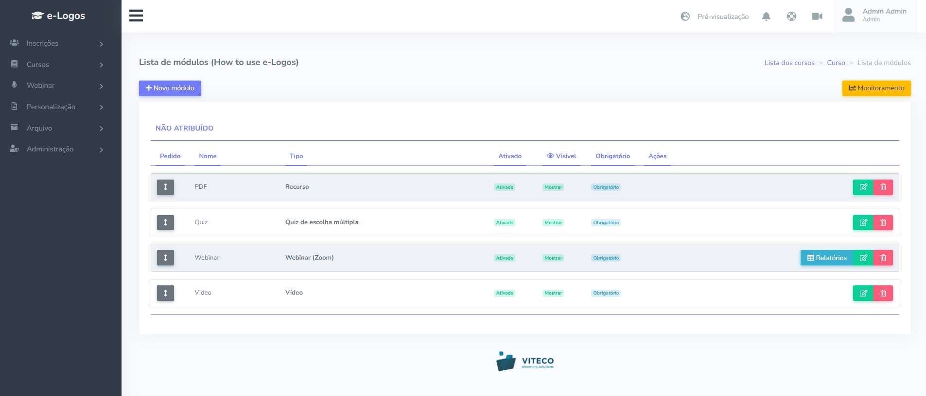 - carregar cursos ilimitados, com módulos interativos e módulos introdutórios;