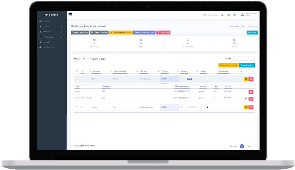 Da, cu e-Logos poți programa webinarii. În LMS ai instrumente interactive pentru a implica cursanții și a le facilita învățarea. De asemenea, poți înregistra lecțiile și le poți încărca ulterior în mod asincron.